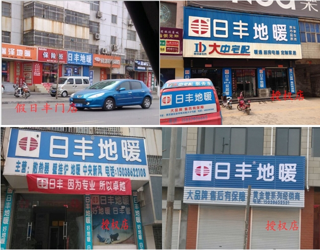 如下為真假日豐門頭對比,大家仔細看就能辨別真偽,授權店的門招藍色部分一律是“標志 日豐地暖”,而且不會打與品牌無關的字樣,其他字樣一般打在下面白色部分,要求門招上面不允許打任何競品字樣,而且藍色部分與白色部分的比例為2:1